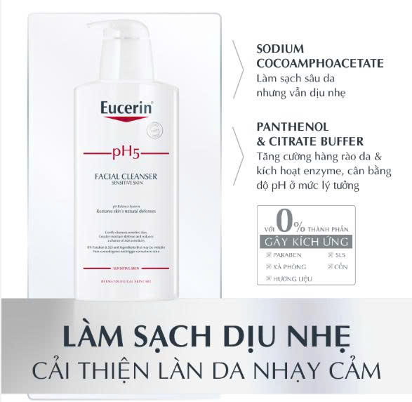 Eucerin® pH5 Facial Cleanser Sensitive Skin được nghiên cứu với công thức phù hợp cho mọi loại da, kể cả da nhạy cảm và da bé từ 1 tháng tuổi. Sản phẩm có pH cân bằng và không chứa các thành phần gây kích ứng phổ biến như xà phòng, hương liệu, paraben, SLS. Sản phẩm giúp làm sạch nhẹ nhàng mà không làm khô hay tổn thương da. Với công dụng làm sạch và duy trì độ ẩm tự nhiên, Eucerin® pH5 là một lựa chọn đáng tin cậy để chăm sóc da nhạy cảm hằng ngày.
